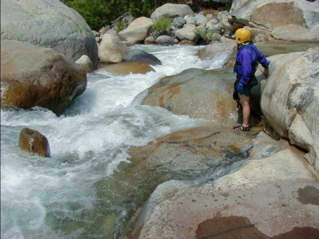 To get to putin, drive 0.7 miles past the entrance station into Sequoia National Park. Park on the right in the Turnout adjacent the sewage treatment plant. The trailhead is at the top end of the turnout. Take the easy Trail 1/4 mile and 200 vertical feet down to the river. The putin is anywhere in the pool below the Iron Lung Gorge. You can warm up with some cliff jumping from anywhere up to 70 feet.