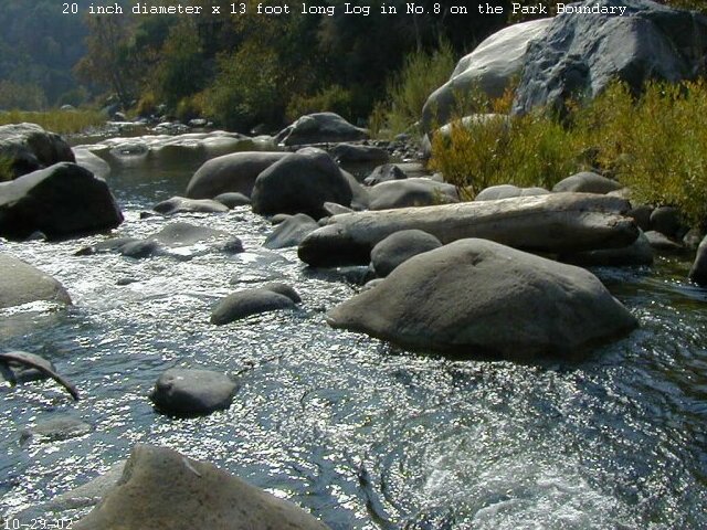 • 07-02-10 There is a hazard dangling over the diversion dam at the Park Boundary. It is the Edison Company log boom that guards the intake facility for the flume serving Kaweah Plant No. 2. It has been there ever since the peak flows washed it out and does not seem to be going away anytime soon. It is being held in place by the chain still attached to one end of the boom and the other end of the chain attached to the top of the dam. As the boundary drops to runable levels in the next several weeks be aware of this hazard. The log boom is only a few feet right of the line that is normally taken to run the dam.