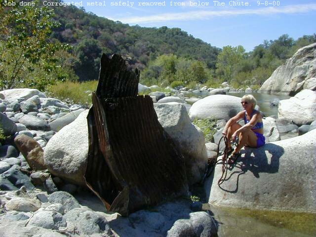 • 09-11-00 A large and ugly piece of a metal building was recently removed from the river below the Chute. The metal appeared after the Jan. 1997 flood. We know it's a metal building because the padlock is still on the door. Removing the metal: Image 1 , Image 2 , Image 3 , Image 4 .