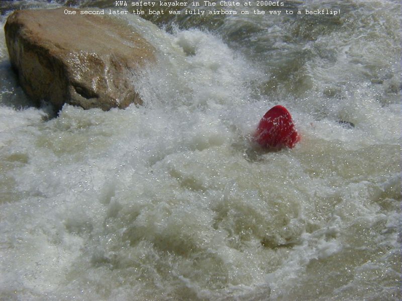 • 04-28-03 A report has come in that would confirm the suspicion that you don't want to run the right side of the center channel at Powerhouse. Some major carnage was reported on Sunday when the boater was deflected by a submerged rock and shot off course and down the right side. Reports indicate 5 separate thrashings and amazingly the boater came out unharmed and still in his boat. It is reported that you don't want to repeat any portion of this stunt. Video of the incident is reported to be worth $15,000 and maybe more if it were available.