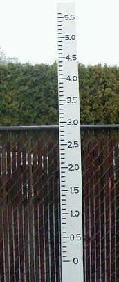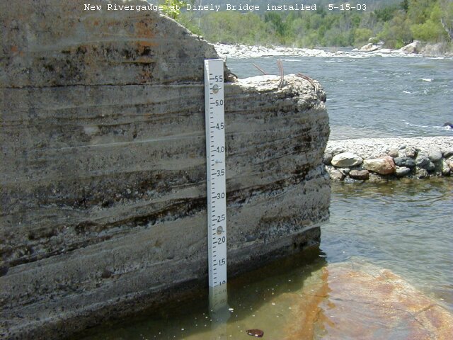 • 05-15-03 The new Dinely Rivergauge has been installed. The river channel was scoured deeper by the Nov 8, 2002 flood so the gauge will NOT read the same as before. The river level is lower now for the same flow rate. The gauge has been positioned to try to account for the change but it will never read the same as before nor will the flow vs. gauge height follow the same curve. We are starting over with a whole new frame of reference.