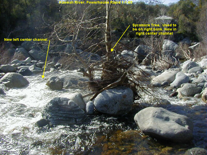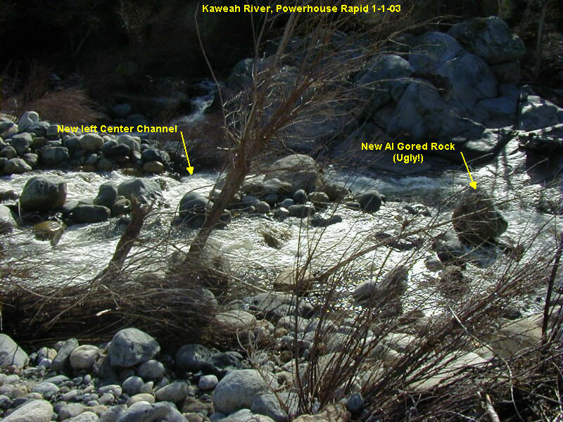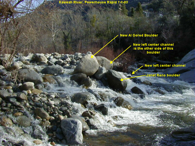 • 01-02-03 The Kaweah River Webcam is back. Scroll down a tad and you'll see the image. Powerhouse rapid was personally inspected by the webmaster after the Nov 8th flood. It is not as bad as previously reported. While it is true that the right side of the center channel is quite ugly after the arrival of the Al Gored boulder mounted high and above the Janet Reno boulder, the flood has removed a portion of the island separating the center channel from the left channel. The new 'left center' channel appears to be a straight shot, joining the flow from the left channel 60 feet upstream from the Al Gored rock. These pictures will make it clearer (maybe). Photos are taken at a flow of 250 cfs @ Threerivers. Powerhouse 1 is taken from the bank right of the center channel looking to river left, Powerhouse 2 is taken from the top of the center channel looking downstream, Powerhouse 3 is taken from the top of the center channel further upstream looking downstream, Powerhouse 4 is taken from adjacent to the Al Gored boulder at the bottom of the right center channellooking to river left, Powerhouse 5 is taken from below the center channel looking upstream,