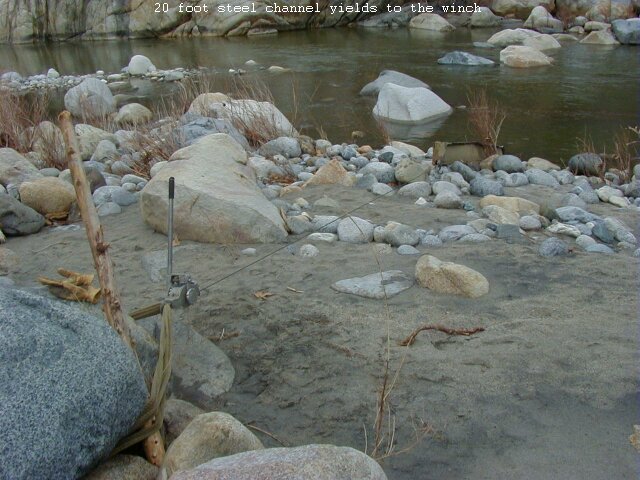 • 09-28-09 A 21 foot long, 620 pound, 12x3 inch Steel Channel Beam was discovered 100 yards below The Chute. It took five days of work to get the beam out of the river and winch it 100 feet downstream and up onto the right bank into a 500 year flood safe location. The next flood could have sent this hazardous debris downstream where it could have become lodged in a dangerous location between some of the mega boulders in Headwall Rapid and right in the path of boating. Hopefully we can get this beam cut up into smaller pieces someday for easier permanent removal from the river vicinity. There are about 20 more steel beams similar to this one scattered in the two miles below the Southern California Edison Bridge at the Park Boundary. That bridge partially washed out in the flood of January 1997 leaving alot of hazardous steel in the river ever since. At least one beam is in a very dangerous position crosswise to the current in the middle of a commonly run drop above No. 11 on the Park Boundary run. You can follow the beam removal project with this series of three photos.